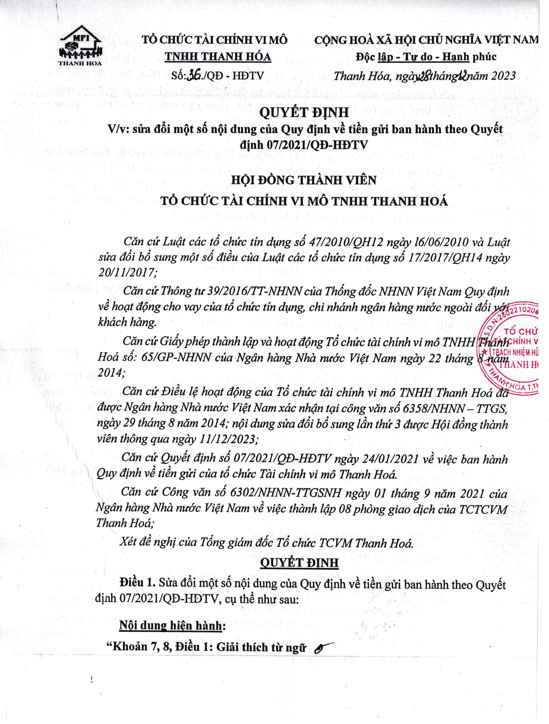 QĐ 36QD-HTTV 28/12/2023 sửa đổi một số nội dung của Quy định về tiền gửi