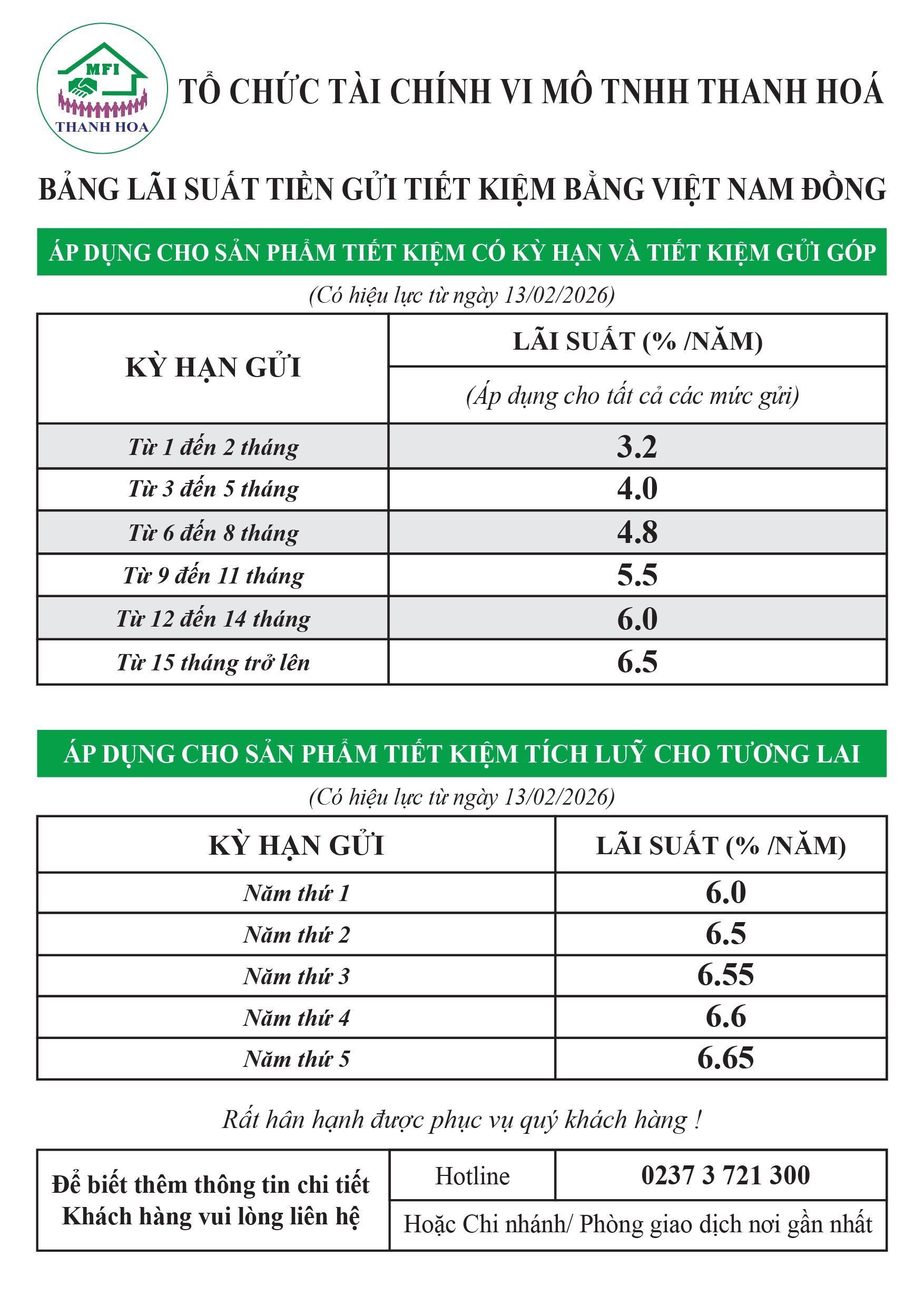 - Bảng lãi suất sau đây: quy định lãi suất cho sản phẩm Tiết kiệm có kỳ hạn, với loại tiền gửi là Việt Nam đồng, bắt đầu có hiệu lực từ ngày 13/02/2026